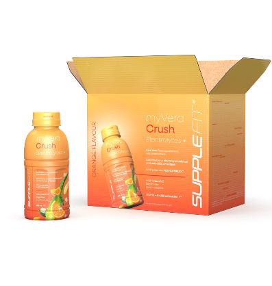 MYVERA CRUSH Electrolytes + est un complément alimentaire avec édulcorants à base de jus et pulpe d'Aloe Vera et de Vitamine C, caractérisé par un délicieux goût d'orange.